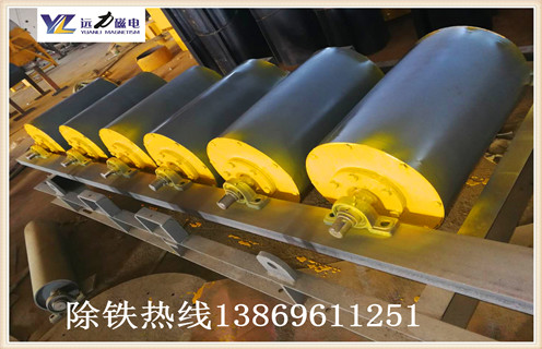 相當于把干式弱磁滾筒裝在皮帶運輸機上代替頭輪,或者說在皮帶機頭輪內裝上磁系。磁系包角為360度。主要由:磁系、滾筒、磁軛、鋁環、皮帶組成。